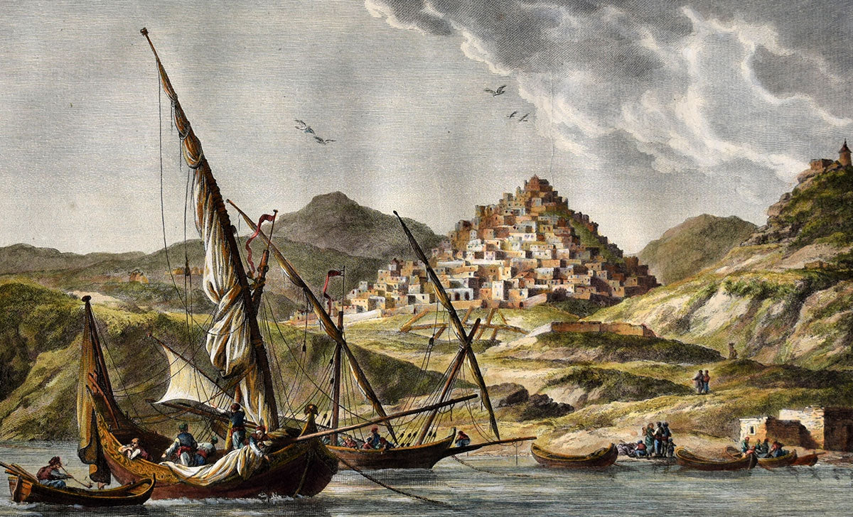 Εντυπωσιακή άποψη της Σύρου. Αυθεντική γκραβούρα άνω των 230 ετών, επιχρωματισμένη με ακουαρέλα, από Γαλλική περιηγητική έκδοση του C. Gouffier. Παραδίδεται με πιστοποιητικό γνησιότητας. Λεκές στα περιθώρια.